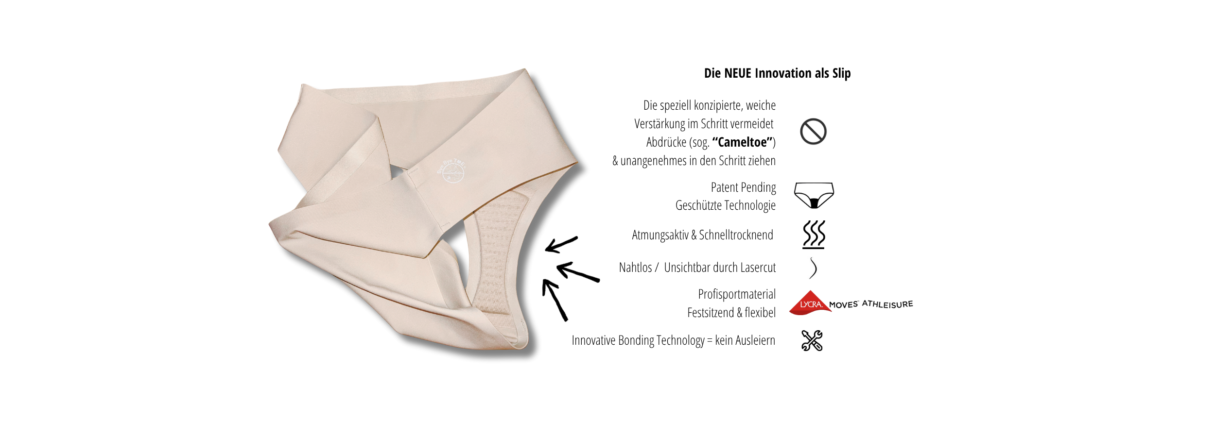 Das verstärkte Inlay: Ein speziell entwickeltes, integriertes Polster, das sich superweich anfühlt – ähnlich wie BH-Polster –, aber stabil genug ist, um den sogenannten „Cameltoe“-Effekt (das Abzeichnen der Vulva unter der Kleidung) zu verhindern. Herkömmliche Produkte arbeiten meist nur mit mehreren Stofflagen, die leicht verrutschen oder sich zusammenknäueln und den Effekt eher verstärken.