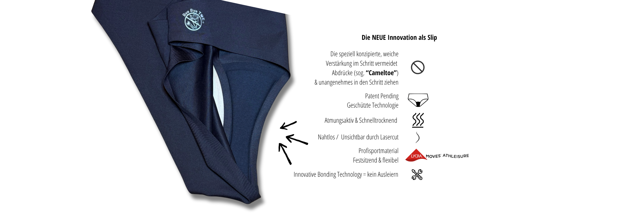 Periodenunterwäsche verfolgt ein ganz anderes Ziel und ist auch komplett anders verarbeitet. Sie besteht aus mehreren Stofflagen, die jeweils verschiedene Aufgaben übernehmen. ByeByeToe® hingegen arbeitet mit einem speziell entwickelten Polster – ähnlich wie man es von BHs kennt. Dieses ist fest eingeklebt, bleibt aber atmungsaktiv. Stofflagen oder auch eingeklebte Slipeinlagen können sich zusammenknäulen und dadurch den sogenannten Cameltoe-Effekt sogar verstärken. Das Polster von ByeByeToe® ist hingegen stabil genug, um diesen Effekt gezielt zu kaschieren.