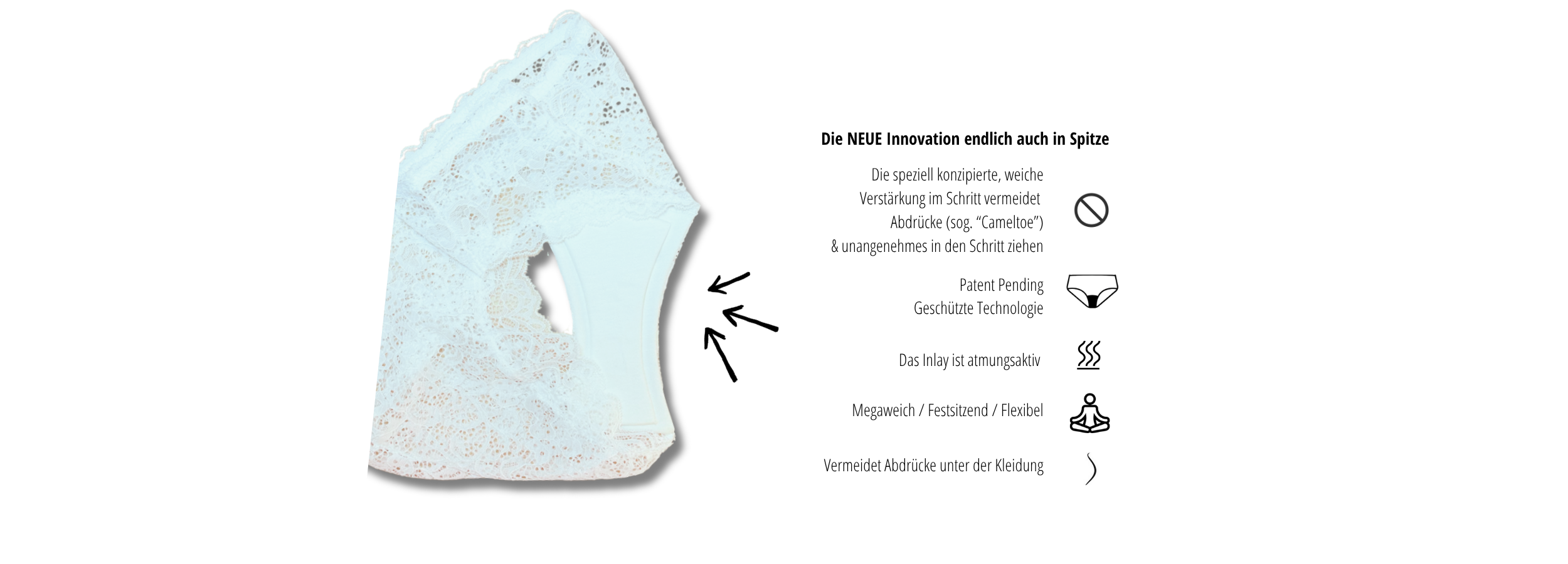 Das verstärkte Inlay: Ein speziell entwickeltes, integriertes Polster, das sich superweich anfühlt – ähnlich wie BH-Polster –, aber stabil genug ist, um den sogenannten „Cameltoe“-Effekt (das Abzeichnen der Vulva unter der Kleidung) zu verhindern. Herkömmliche Produkte arbeiten meist nur mit mehreren Stofflagen, die leicht verrutschen oder sich zusammenknäueln und den Effekt eher verstärken.