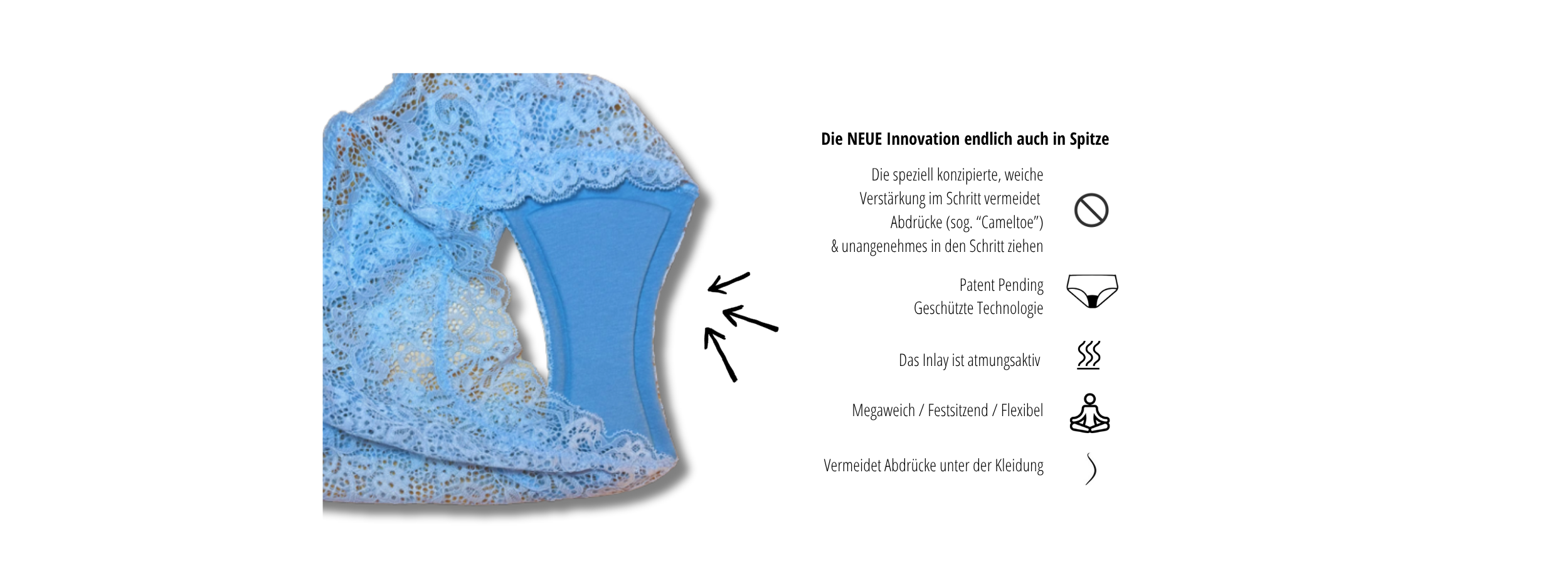 Das verstärkte Inlay: Ein speziell entwickeltes, integriertes Polster, das sich superweich anfühlt – ähnlich wie BH-Polster –, aber stabil genug ist, um den sogenannten „Cameltoe“-Effekt (das Abzeichnen der Vulva unter der Kleidung) zu verhindern. Herkömmliche Produkte arbeiten meist nur mit mehreren Stofflagen, die leicht verrutschen oder sich zusammenknäueln und den Effekt eher verstärken.